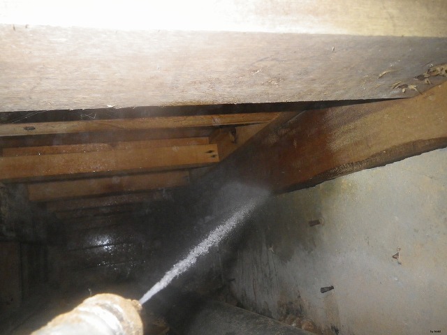 今回は、自分が床下で薬剤散布をしている間に服部さんが、玄関やお風呂場の穿孔薬剤注入をしてくださいました。