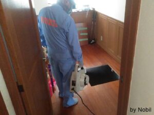 当社以外にも3つの会社が協力して市の職員の方と被害宅を回り、微力でがありますが外周の消毒・床上浸水宅には、室内の微粒子空間消毒を行いました。
